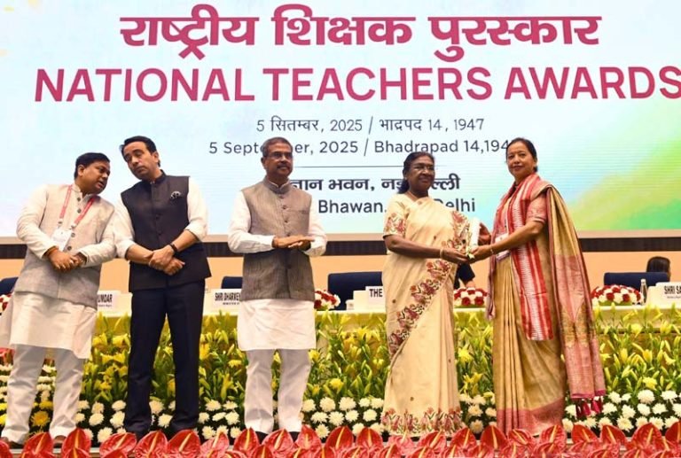नई दिल्ली के विज्ञान भवन में आयोजित राष्ट्रीय शिक्षक पुरस्कार-2025 समारोह में भारत की राष्ट्रपति श्रीमती द्रौपदी मुर्मू की उपस्थिति में केंद्रीय शिक्षा मंत्री धर्मेन्द्र प्रधान ने देशभर के 45 उत्कृष्ट शिक्षकों को सम्मानित किया।