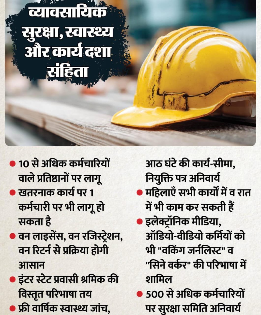 व्यावसायिक सुरक्षा, स्वास्थ्य और कार्य स्थितियां संहिता-2020 में 13 कानूनों को समाहित किया गया है। इसके तहत नियोक्ताओं को 40 साल से ज्यादा उम्र के सभी कर्मचारियों की सालाना मुफ्त स्वास्थ्य जांच करानी होगी। महिलाओं को सभी जगहों पर सभी तरह के काम करने की इजाजत है, बशर्ते उनकी सहमति हो और जरूरी सुरक्षा उपाय किए गए हों। अस्थायी और अनुबंधित कामगारों को भी स्थायी कर्मचारियों के बराबर सभी लाभ।