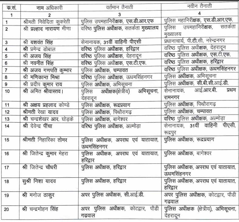 सचिव गृह शैलेश बगोली की ओर से जारी आदेश के मुताबिक, पुलिस उप महानिरीक्षक एसडीआरएफ निवेदिता कुकरेती को एसडीआरएफ में आईजी बनाया है। एसएसपी विजिलेंस प्रह्लाद नारायण मीणा को डीआईजी विजिलेंस बनाया है। 31वीं वाहिनी पीएसी में सेनानायक यशवंत सिंह को पीटीसी नरेंद्रनगर में प्रधानाचार्य बनाया है। एसपी अभिसूचना प्रदीप कुमार राय को एसपी सीबीसीआईडी बनाया है। एसपी हरिद्वार जितेंद्र चौधरी को एसपी अपराध एवं यातायात यूएस नगर, एसपी हरिद्वार निशा यादव को एसपी अपराध एवं यातायात हरिद्वार, एएसपी सीआईडी मनोज ठाकुर को एएसपी कोटद्वार और एएसपी चंद्रमोहन सिंह को एसपी क्षेत्रीय अभिसूचना के पद पर तैनात किया गया है।(साभार एजेंसी)