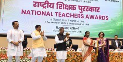 राष्ट्रपति श्रीमती द्रौपदी मुर्मु ने (5 सितंबर, 2024) शिक्षक दिवस पर नई दिल्ली में आयोजित एक समारोह में देश भर के शिक्षकों को राष्ट्रीय पुरस्कार प्रदान किए।